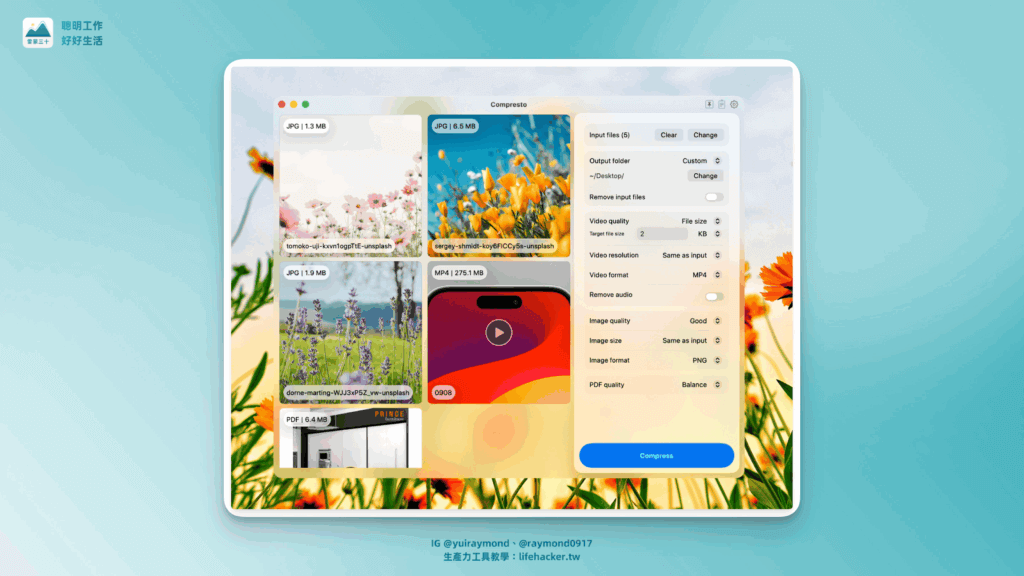 它的核心功能很單純——壓縮檔案。但做得很到位:影片、圖片、PDF、GIF 通通支援,而且壓縮率最高可達 90%,畫質卻幾乎看不出差異。