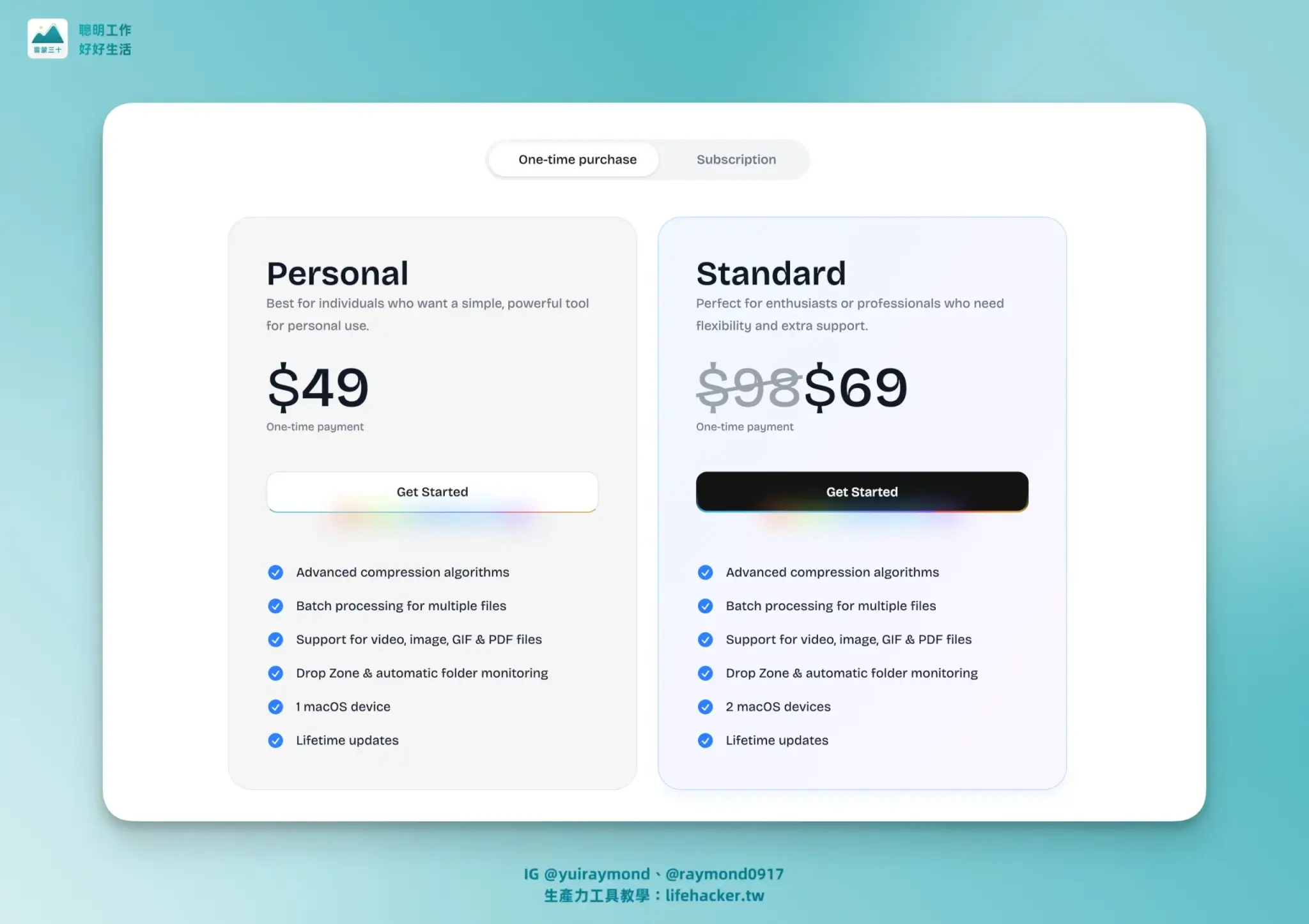 Compresto 提供了靈活的定價方案,包括訂閱制和 $49 的買斷制(Personal 方案),對於功能完整度和時間節省效益而言,價格很親民合理 。