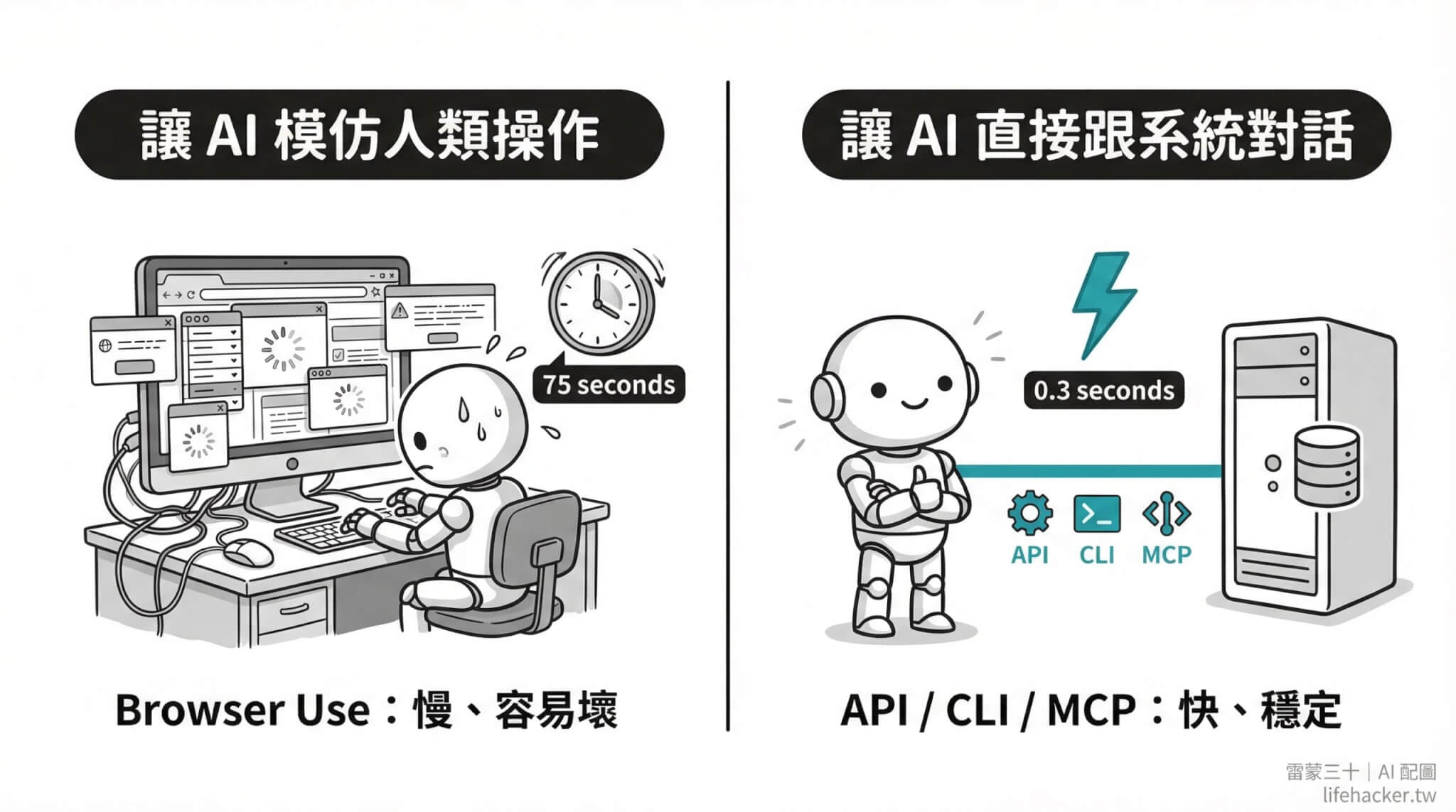 打個比方來說,你讓 AI 控制瀏覽器來發一篇電子報、填寫表單,大概要花上 5~10 分鐘,但透過 API 可能是幾秒鐘的任務。