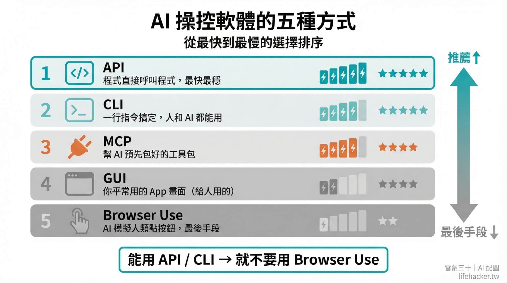 看到了嗎?Browser Use(瀏覽器自動化)不是不好,而是它應該是你「沒有其他路」的時候才走的路。