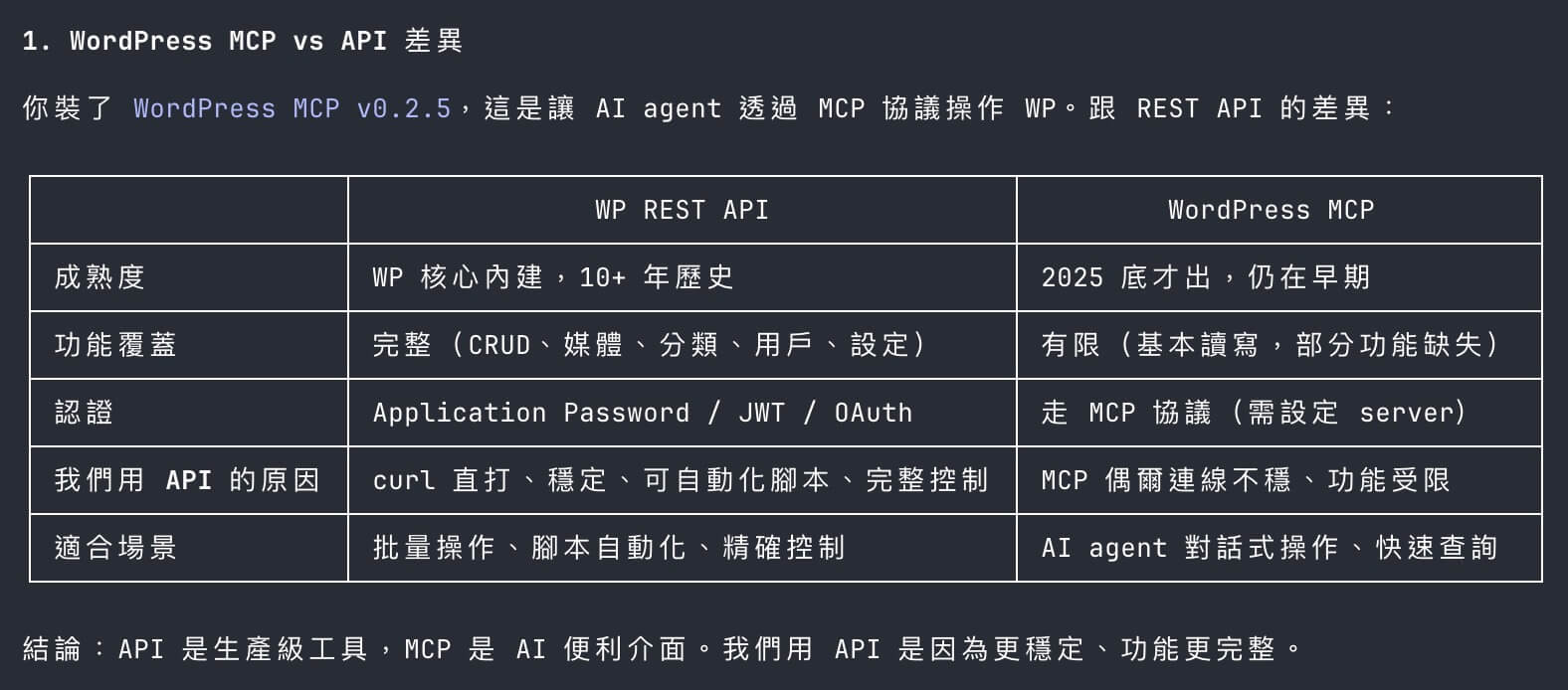 所以我一律都建議,直接讓 AI 幫你查:「你要的工具,在 MCP 跟 API 上,功能跟使用上的差異?」