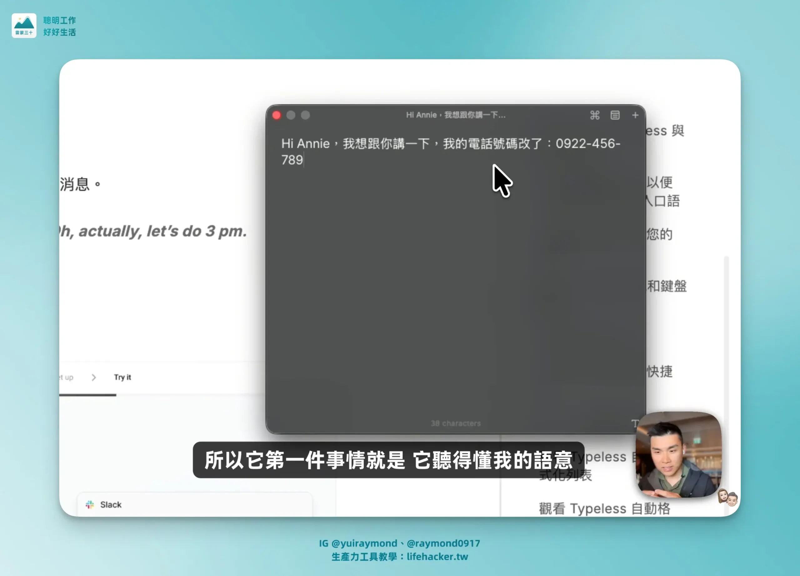 結果:它能聽懂我的修正,直接輸出正確的號碼,還貼心地加上 Dash 分隔線(0922-xxx-xxx)。這在傳統的語音輸入工具中幾乎是不可能做到的。