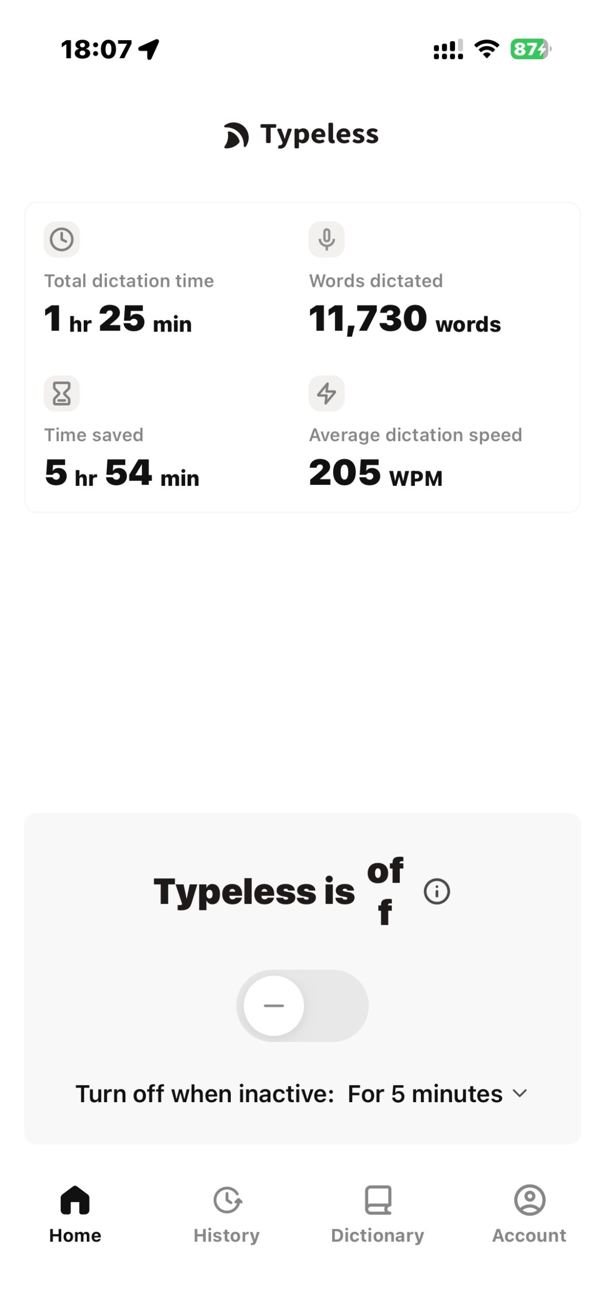 如果不想讓 Typeless 一直常駐開啟,可以在 Typeless App 裡面的「Turn off when inactive」調整為 For 5 minutes 或是 For 12 hours,時間到它就會自動關閉。