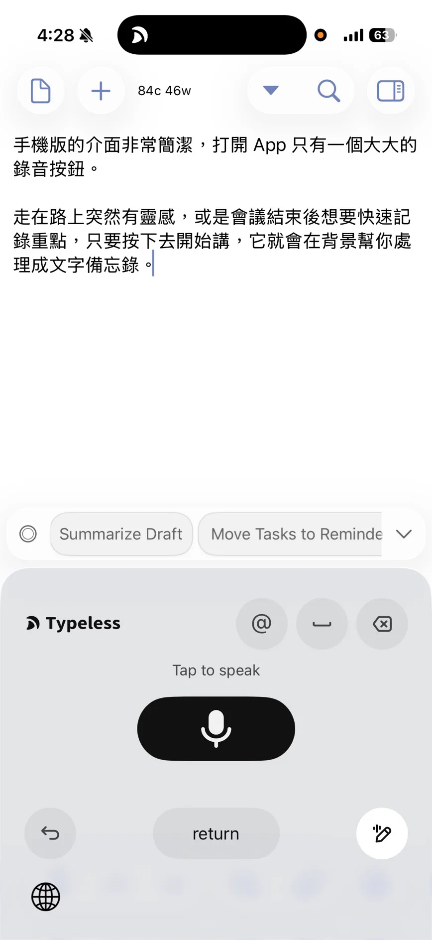 Typeless 不只在 Mac 上好用,它的手機版 App 也是我近期外出時的筆記神器。