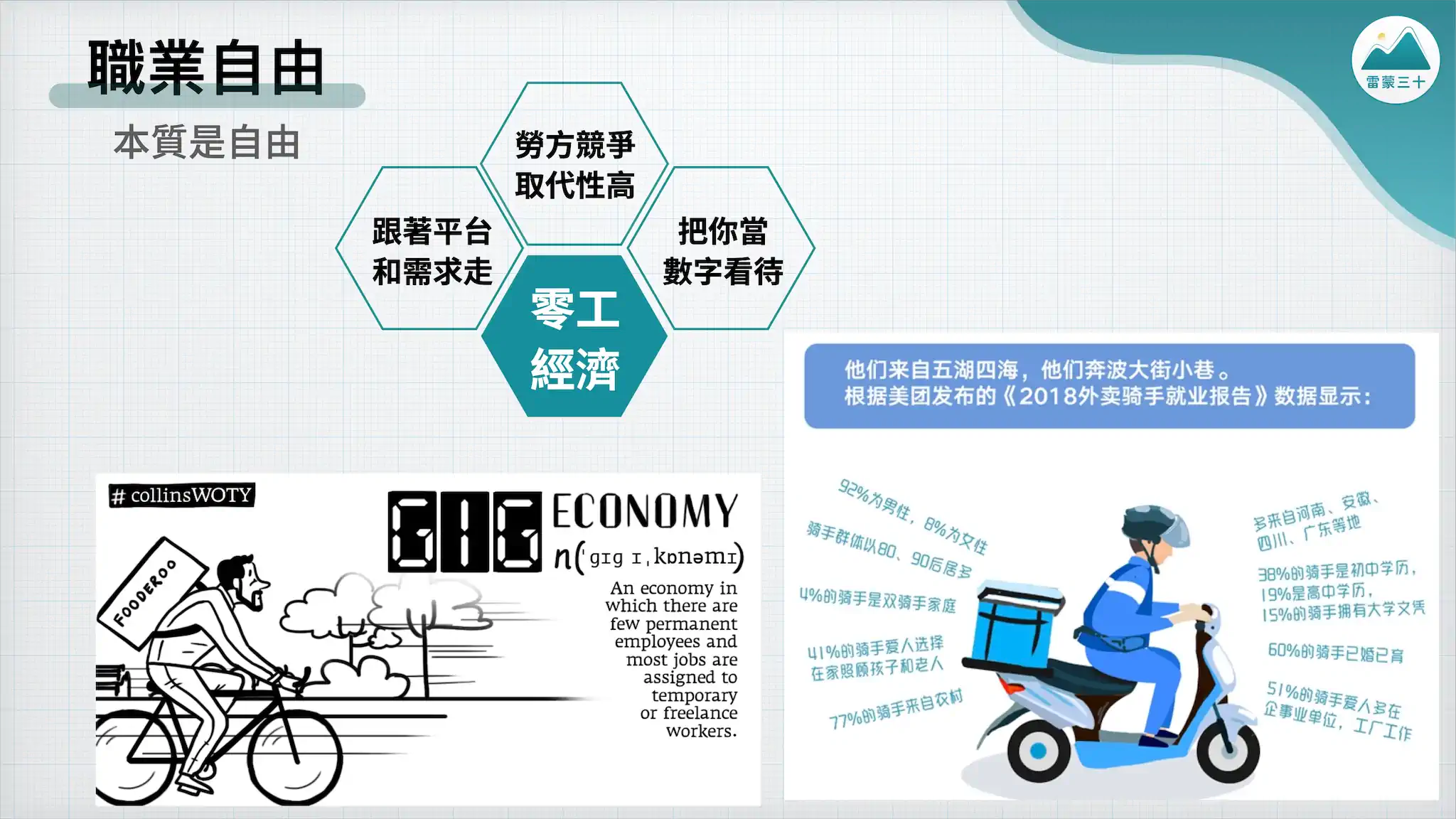不過,零工經濟下的職業自由者,是能成為自由職業者的,從設計兼職做到專業設計,或者外送接單也能做到特定客群的外送服務。只是不容易,轉換比例大概只有 10% 吧?