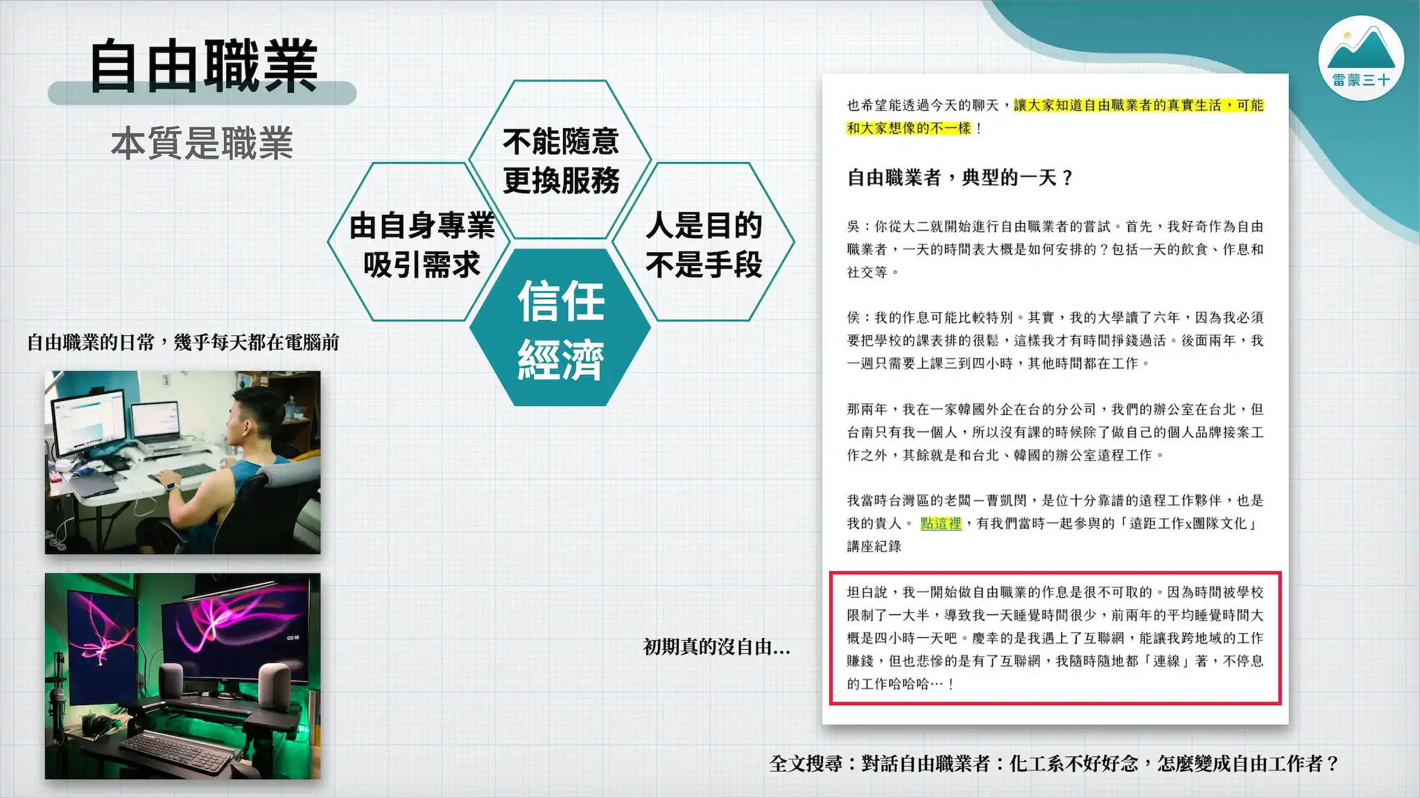 其實不然,我今天想和你談談,在互聯網科技快速進步的時代裡,有很多人可以因此「自由」,但並不是每個人都能「職業」。