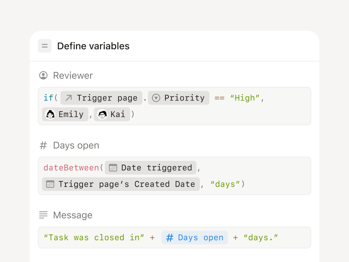 例如當一筆新的資料加入,或團隊任務庫的行動狀態更改時,寄送一封電子郵件通知,甚至還可以插入變數跟其它資料庫和頁面內容,這個自動化功能的升級,我願稱為最強!讓我省下大量的 Zapier 費用,又能更簡易的進行設定。
